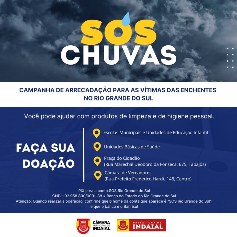 Muitas famílias foram atingidas em virtude das enchentes que aconteceram recentemente no estado do Rio Grande do Sul. Para auxiliar neste difícil momento, a Prefeitura de Indaial está promovendo uma ação de solidariedade com arrecadação de produtos de limpeza e de higiene pessoal.