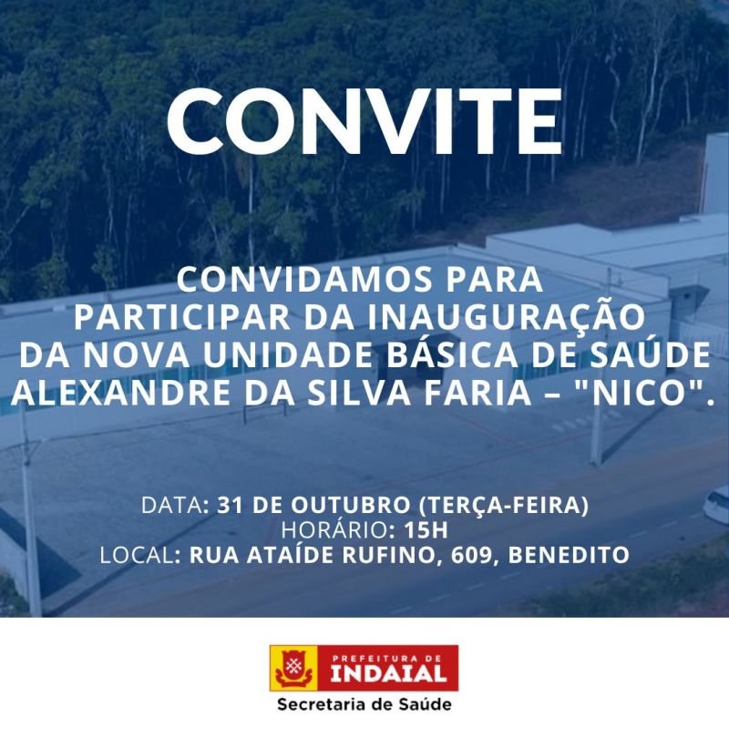 Na próxima terça, 31 de outubro, às 15h, a Secretaria de Saúde de Indaial promove a solenidade oficial de inauguração da nova Unidade Básica de Saúde Alexandre da Silva Faria – "Nico", localizada na rua Ataíde Rufino, nº 609, bairro Benedito. Nico era auxiliar administrativo do Município e trabalhava no Sais. Faleceu em fevereiro de 2020, em decorrência de uma Leucemia descoberta naquele mesmo mês.