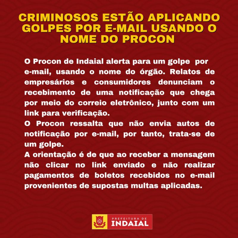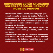 O Procon de Indaial alerta para um golpe por e-mail, usando o nome do órgão. Relatos de empresários e consumidores denunciam o recebimento de uma notificação que chega por meio do correio eletrônico, junto com um link para verificação. O Procon ressalta que não envia autos de notificação por e-mail, por tanto, trata-se de um golpe.