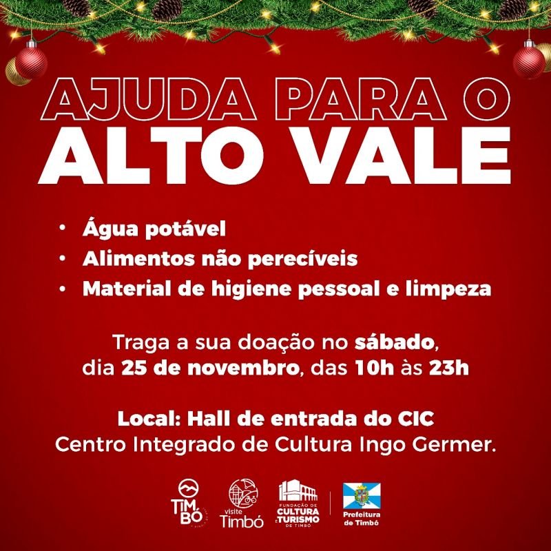 A Prefeitura de Timbó estará promovendo neste sábado, dia 25 de novembro, uma campanha de arrecadação de donativos para as cidades do Alto Vale do Itajaí, que foram fortemente atingidas pela enchente.