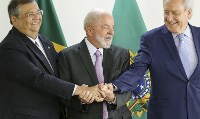 “E feliz porque tenho do meu lado esquerdo um companheiro [Ricardo Lewandowski] que foi extraordinário ministro da Suprema Corte e que deixa uma cadeira vazia que vai ser ocupada por Flávio Dino, não a mesma dele, mas a da Suprema Corte. E ele vai ocupar a cadeira do Flávio Dino”, acrescentou o presidente.