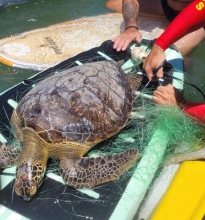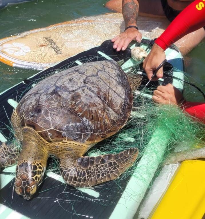 Uma equipe do Corpo de Bombeiros Militar de Santa Catarina (CBMSC) foi acionada para realizar o resgate de uma tartaruga que estava presa a uma rede de pesca na região das praias do Buraco e Central, em Balneário Camboriú.