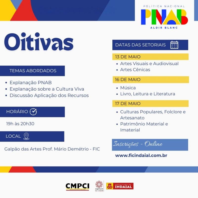 O evento ocorrerá em três datas, 13, 16 e 17 de maio, dividido por segmentos, sempre das 19h às 20h30, no Galpão das Artes Prof. Mário Demétrio – FIC (Rua Dr. Blumenau, 5, Centro). Nos encontros haverá explanação sobre a PNAB e a Cultura Viva, além de discussão da aplicação de recursos.