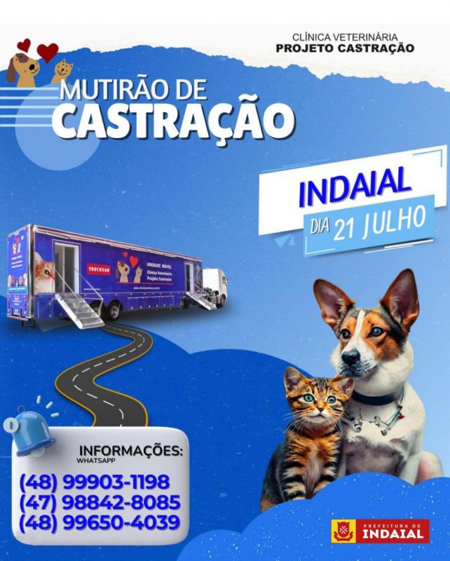 Estão abertas as inscrições para o terceiro Mutirão de Castração Animal de 2024, uma parceria da Prefeitura de Indaial com o Instituto Bem Animal. A ação acontecerá no dia 21 de julho (domingo), no Centro Público de Castração (Rua Marechal Deodoro da Fonseca, 4.600, Ribeirão das Pedras). Cães e gatos poderão ser castrados. No caso de cães, as exceções são para as raças pug, bulldog, pequinês e lulu-da-pomerânia.