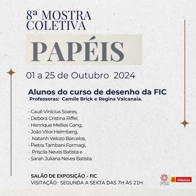 A Fundação Indaialense de Cultura sedia até 25 de outubro a 8ª Mostra “Papéis”, coletiva de alunos dos cursos de Artes Visuais da FIC, coordenada pelas professoras Camile Brick e Regina Valcanaia. A mostra traz para o salão de exposições trabalhos dos participantes, que têm se destacado em sua produção artística sobre um dos suportes mais utilizados no desenho e na pintura – o papel.