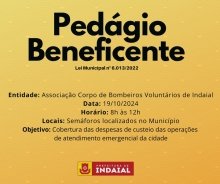Será realizado neste sábado, 19 de outubro, das 8h às 12h, um pedágio beneficente em diversos semáforos do Município. O objetivo da ação é arrecadar fundos para custeios das operações de atendimento emergencial da cidade realizadas pela Associação Corpo de Bombeiros Voluntários de Indaial.