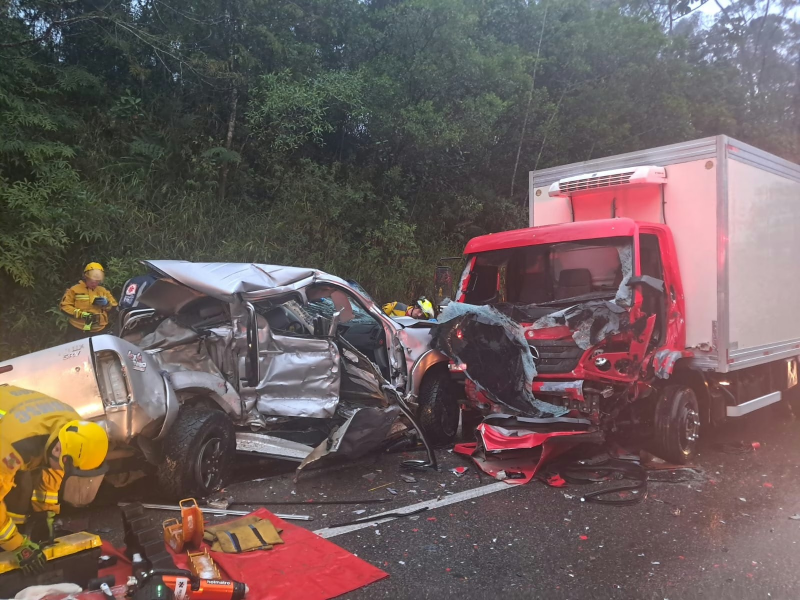 As equipes do Corpo de Bombeiros Militar de Santa Catarina foram acionadas e encontraram três vítimas presas às ferragens. O condutor do caminhão estava consciente e foi resgatado após a abertura da porta do veículo, sendo atendido pelo SAMU.
