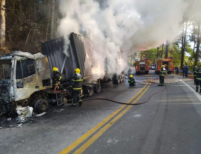 O acidente ocorreu por volta das 6h30, no sentido Serra, e provocou a interdição total da rodovia nos dois sentidos. Equipes da Polícia Rodoviária Federal e do Corpo de Bombeiros foram mobilizadas para controlar o incêndio e realizar o rescaldo da área. A vegetação às margens da pista também foi atingida, aumentando o risco de novos focos.