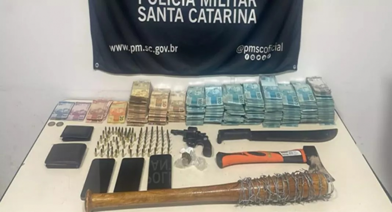 Casal é preso com quase R$ 400 mil em dinheiro, armas e drogas em Gaspar