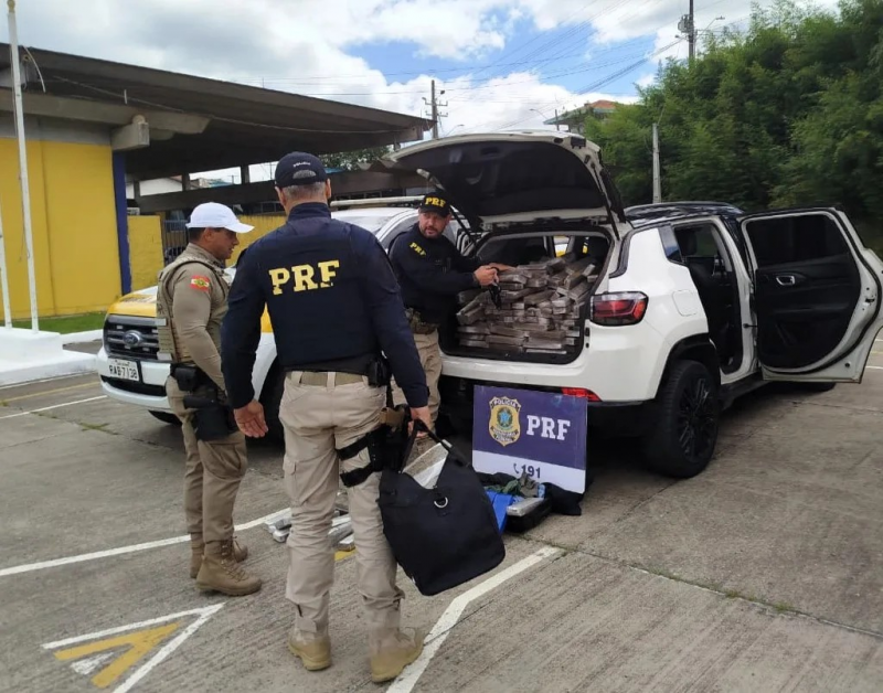 Os agentes localizaram o automóvel e realizaram a abordagem. Durante a vistoria, os policiais encontraram grande quantidade de tabletes de maconha distribuídos por vários pontos do Jeep Compass: no assoalho do passageiro, sobre o banco traseiro e no porta‑malas, onde parte da carga estava escondida dentro de malas de viagem. A disposição da droga indicava que o veículo havia sido preparado exclusivamente para o transporte do entorpecente.