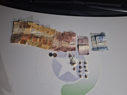 Durante a abordagem, cinco homens foram revistados. O adolescente foi visto jogando uma pochete atrás de uma mesa, fato confirmado por uma testemunha. Dentro da pochete, os policiais encontraram cerca de 15 gramas de substância semelhante a crack, dividida em 12 porções, além de R$ 261,75 em dinheiro. Questionado, o jovem assumiu a posse da droga e disse que seria para consumo próprio, alegando que o dinheiro era proveniente de seu salário.