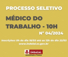 A Secretaria de Administração e Finanças de Indaial lançou o edital do processo seletivo simplificado nº 004/2024, que visa à contratação de Médico do Trabalho. Há uma vaga. O profissional com carga horária de 10h receberá salário mensal de R$4.111,18. Ainda há acréscimo de insalubridade de 20% do salário-base e vale-alimentação proporcional à carga horária.