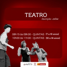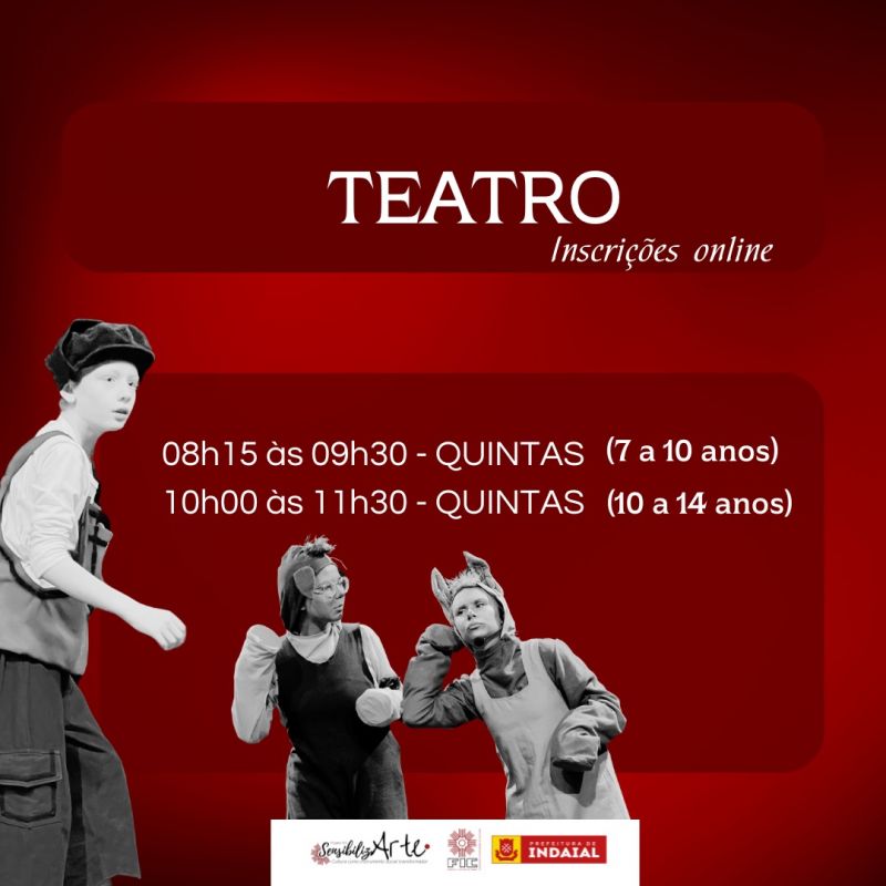A Fundação Indaialense de Cultura está com vagas abertas no curso gratuito de Teatro. Os encontros irão ocorrer na sede da FIC. Há horários disponíveis nas quintas, das 8h15 às 9h30 para pessoas de 7 a 10 anos e 10h às 11h30 para quem tem de 10 a 14 anos.