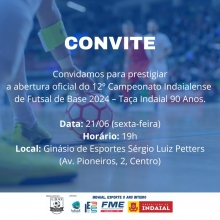 Nesta sexta-feira, 21 de junho, ocorrerá a abertura do 12º Campeonato Indaialense de Futsal de Base 2024 – Taça Indaial 90 Anos, promovido pela Liga Desportiva Vale do Itajaí com apoio da Fundação Municipal de Esportes. A solenidade será às 19h, no Ginásio de Esportes Sérgio Luiz Petters (Av. Pioneiros, 2, Centro).