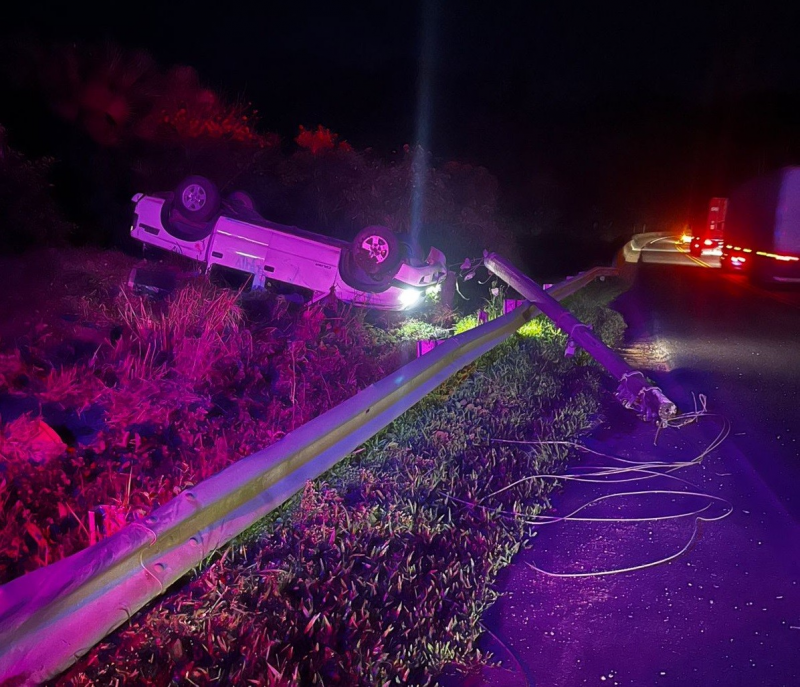 A colisão foi tão intensa que derrubou o poste de energia, fazendo a camionete capotar na beira da rodovia.