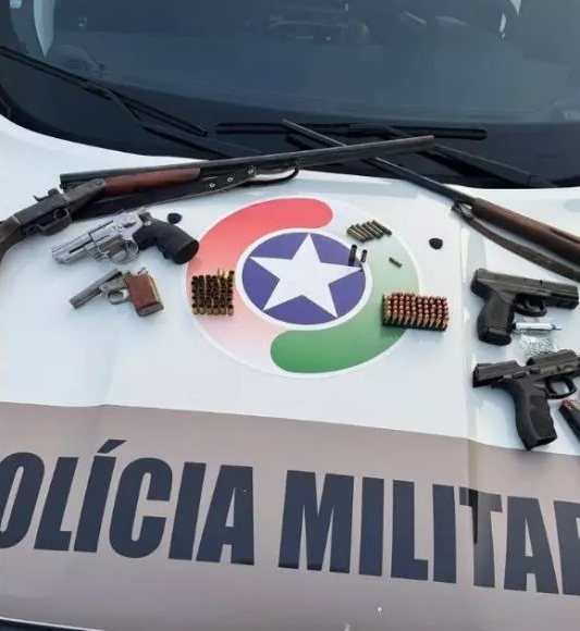 A PM localizou o carro do suspeito, onde encontraram duas espingardas, uma pistola calibre 380, uma garrucha, duas armas de airsoft (Co2) e vários estojos deflagrados de calibre 380.