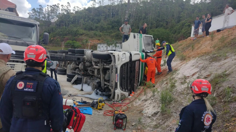 Um acidente de trânsito aconteceu na tarde desta quarta-feira (30) na rodovia SC-486, no km 48, entre Botuverá e Brusque. Um caminhão tombou, deixando o motorista preso nas ferragens. De acordo com informações preliminares da Polícia Militar Rodoviária (PMRv), o motorista está consciente e orientado, sendo atendido pelos bombeiros. Equipes de resgate estão no local trabalhando para retirar a vítima do veículo.