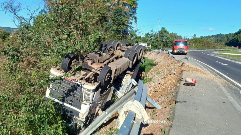 O caminhão ficou tombado com as rodas para cima, ocupando parte da lateral da pista. A Polícia Rodoviária Federal assumiu o controle da área para garantir a segurança e a fluidez do tráfego. As causas do acidente ainda não foram esclarecidas.