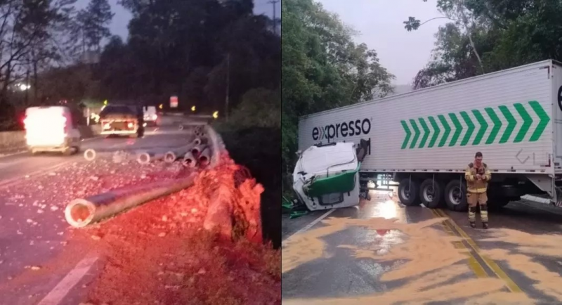 O primeiro incidente ocorreu por volta das 5h55, no bairro Diamante, em Rodeio. Uma carreta que transportava postes de concreto saiu da pista e tombou fora da via. Parte da carga foi projetada sobre a ponte que conecta os municípios de Rodeio e Ascurra, o que comprometeu parcialmente a passagem de veículos. A remoção dos materiais foi feita com o auxílio do equipamento do próprio caminhão, permitindo a liberação do trânsito por volta das 8h.