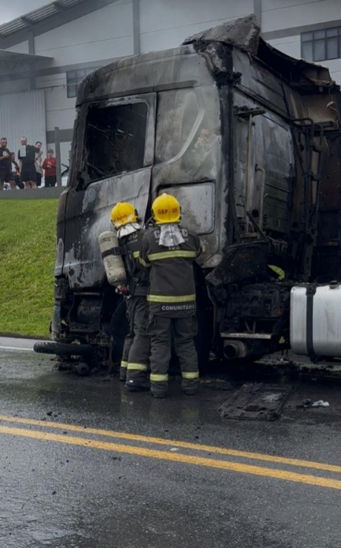 Ao chegarem ao local, os bombeiros encontraram o veículo pesado parado no acostamento, enquanto populares tentavam conter as chamas. As equipes conseguiram extinguir o incêndio rapidamente, evitando que se espalhasse para outras partes da carreta. A motocicleta ficou presa sob a cabine.